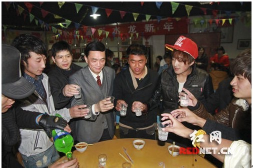 “古突”之夜吸引了其他专业的员工一起来过节。许多汉族员工端着“古突”吃得热火朝天。藏族学子们吃得兴起时,时而高歌一曲,现场气氛很是热闹。